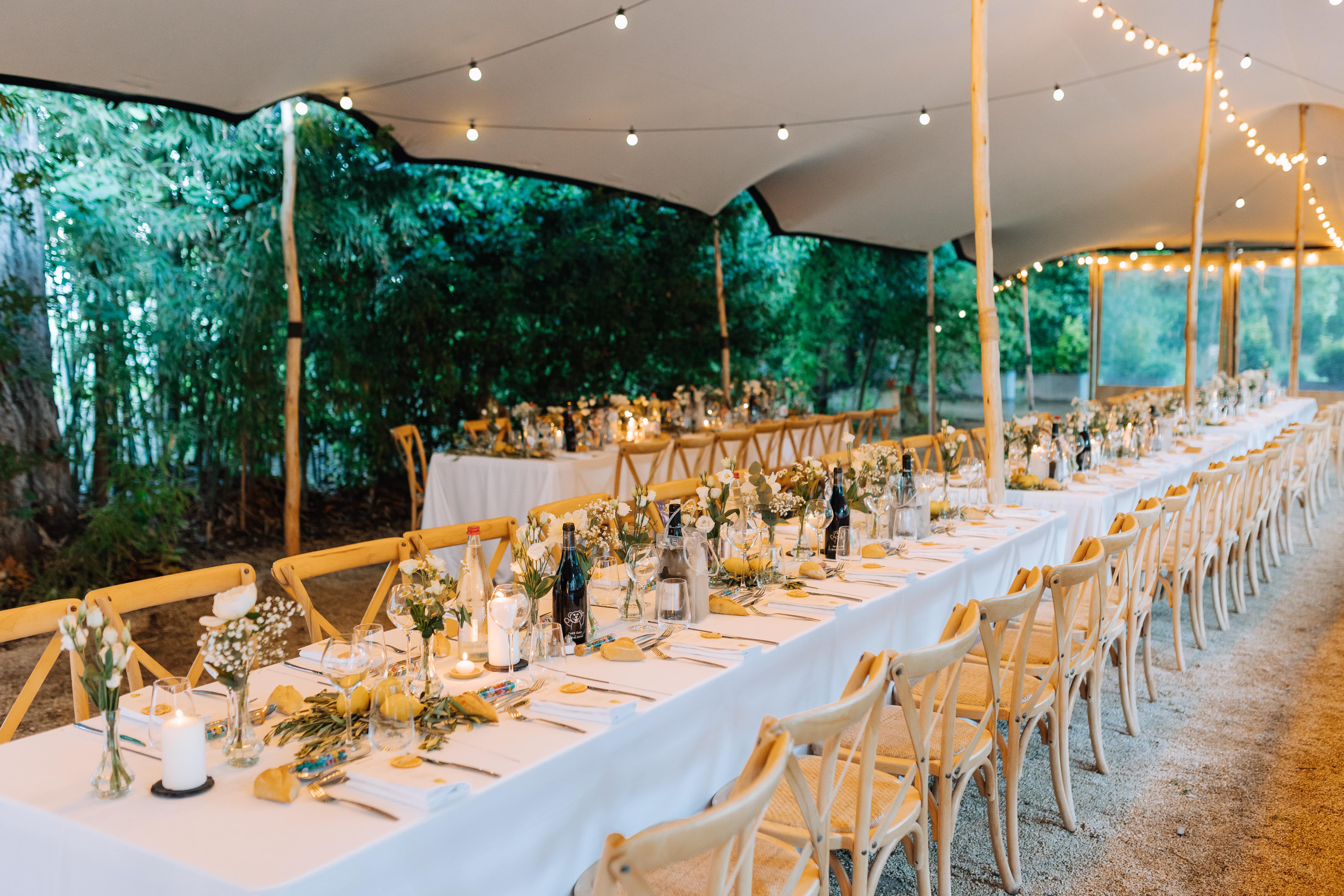 Si les couples évitent souvent les dîners 100 % en extérieur lors de cette période, le Domaine propose une alternative élégante : un dîner sous tente, prolongement direct de la magnanerie, permettant de profiter du charme du domaine tout en restant à l’abri des fraîcheurs du soir.