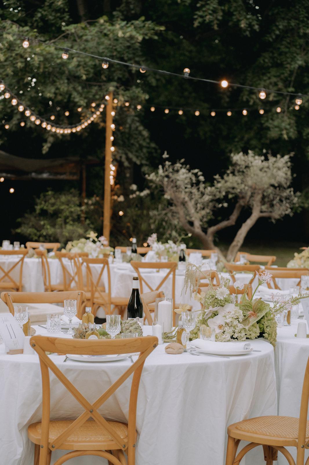Sous les grands arbres du domaine, une longue table blanche est dressée pour un dîner de mariage inoubliable. Les fleurs délicates, les bougies et la vaisselle raffinée viennent sublimer cette table élégante, où les invités pourront partager un repas dans une ambiance chic et champêtre. Chaque détail, des arrangements floraux aux couleurs pastel à la vaisselle soigneusement choisie, reflète une esthétique provençale sophistiquée.